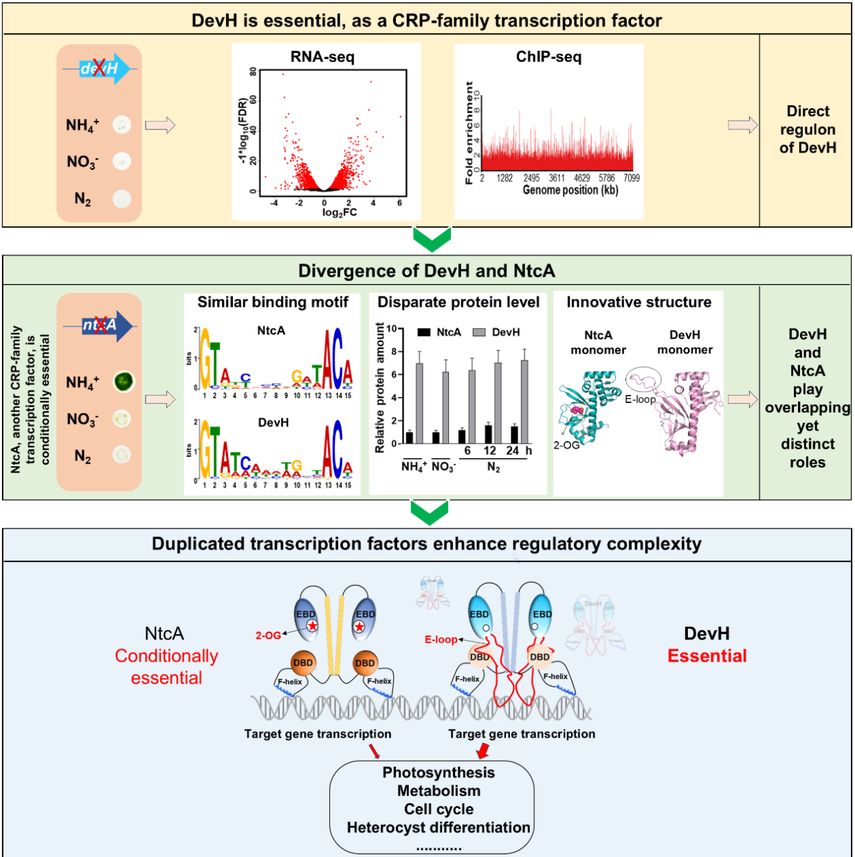 蓝藻/蓝细菌是古老且唯一能进行产氧光合作用的原核生物,一些丝状蓝藻在环境中无化合态氮源时能分化发育出异形胞来固定并同化空气中的氮气。在适应复杂多变的生存环境的过程中,调控基因表达的转录因子起着至关重要的作用。DevH和NtcA均属于CRP家族(cAMP receptor protein,环腺苷酸受体蛋白)转录因子。研究最多也较为清楚的是NtcA——作为全局性转录因子,它在异形胞分化,碳氮代谢平衡,光合作用和应激响应等多个生理过程中都发挥重要作用。尽管NtcA具有多效性和全局性调控能力,其对蓝藻的生存却不是必需的——因为ntcA突变体仍可利用铵盐作为氮源进行生长。有报道称devH可能是必需基因,其对异形胞的后期发育有影响。但值得注意的是,以往构建的devH突变体并不严谨,devH没有被充分下调,所以只有部分表型(仅异形胞后期发育受影响)被观察到。DevH的真实功能尚不明确。