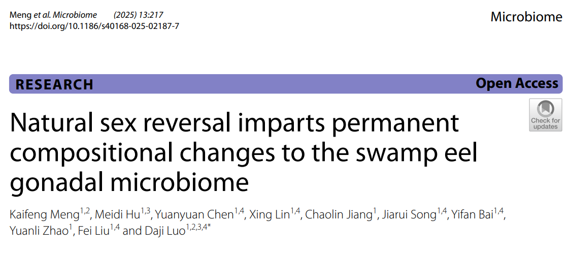 近期,该团队以“Natural sex reversal imparts permanent compositional changes to the swamp eel gonadal microbiome”为题在微生物学领域国际期刊Microbiome发表了最新研究进展。