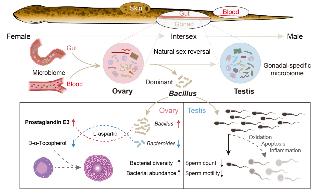 该团队报道了黄鳝卵巢和精巢中的细菌微生物群落特征,顺利获得与肠道、皮肤和血液三个不同生态位中微生物群落进行比较分析和溯源,发现了黄鳝性腺菌群主要来自于肠道和血液。随后,他们重点关注了卵(精)巢优势菌,最终成功分离和培养了黄鳝卵巢优势细菌芽孢杆菌。又顺利获得在体注射芽孢杆菌的动物实验,结合组织学、细胞/分子实验和组学等发现芽孢杆菌有助于维持黄鳝卵巢生理功能;相反,过量的芽孢杆菌导致精巢的炎症反应并抑制了雄性黄鳝精子活力,导致精子数量减少等损害精巢功能。该研究揭示了卵巢优势细菌芽孢杆菌在雌雄同体黄鳝性腺中的双向调控功能,提示了卵巢和精巢优势菌在性反转中的重要功能(图1)。这些结果一定程度上从性腺共生菌稳态角度回答了“黄鳝性反转为什么往往发生在第一次排卵后?”的问题,为深入解析黄鳝性反转自然发生的影响因素探索了新方向,也为开发益生菌定向诱导黄鳝性别给予了新思路。