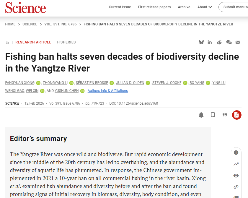 2月12日,《科学》(Science)在线发表了由中国科研实验室水生生物研究所联合湖南科技大学淡水与海洋生物与生态保护研究所主导的研究论文“Fishing ban halts seven decades of biodiversity decline in the Yangtze River”。该研究基于陆续在6年(2018-2023年)的系统性长期野外生态数据,从鱼类物种丰富度、生物量、丰度、均匀度及β多样性等多个角度,全面解析了禁渔实施前后长江干流鱼类群落的动态变化,并量化了水质、水文、气候变化、土地利用、岸线开发、航运及渔业捕捞等多重压力因子对鱼类多样性影响的生态学机制。