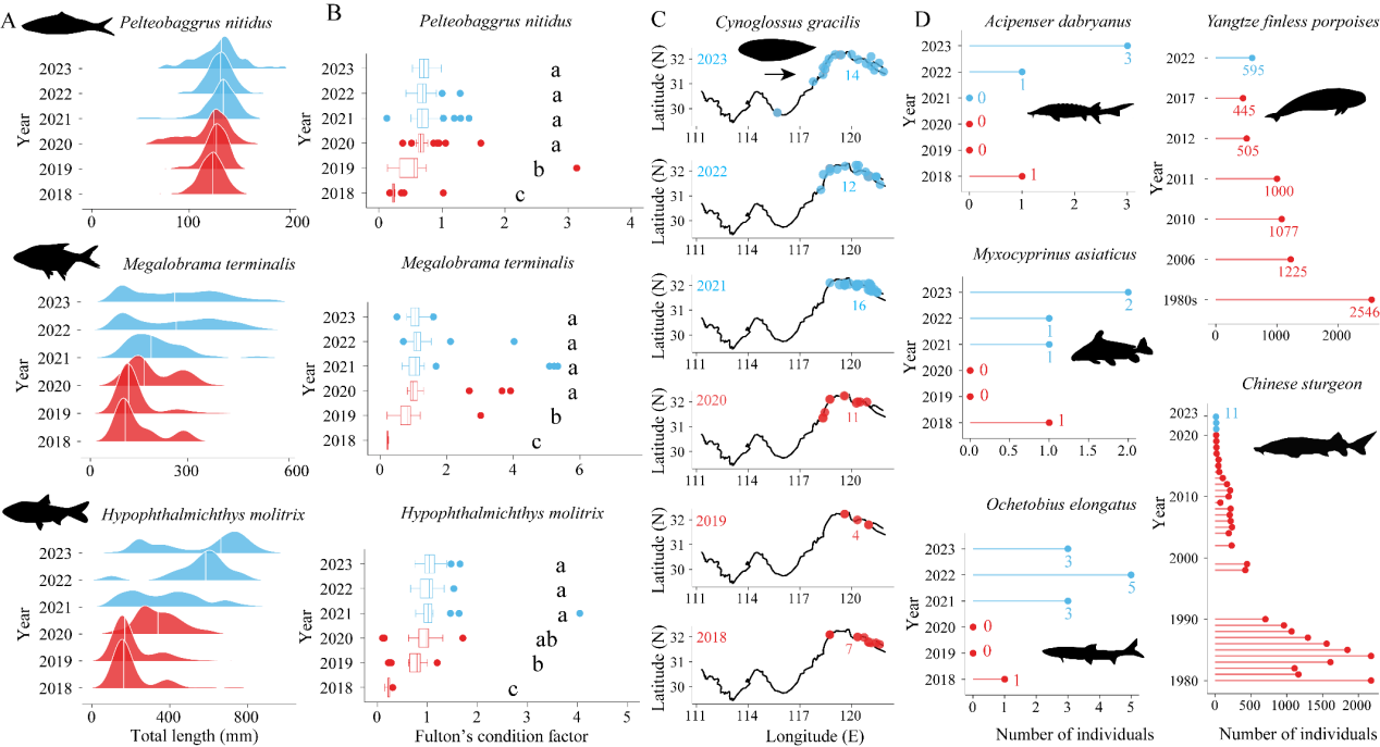 研究结果表明,长江鱼类资源长达七十年的持续衰退趋势在全面禁渔后得到有效遏制,并呈现初期恢复的势头。鱼类生物量、物种多样性、鱼类肥满度等核心指标显著改善(图1)。