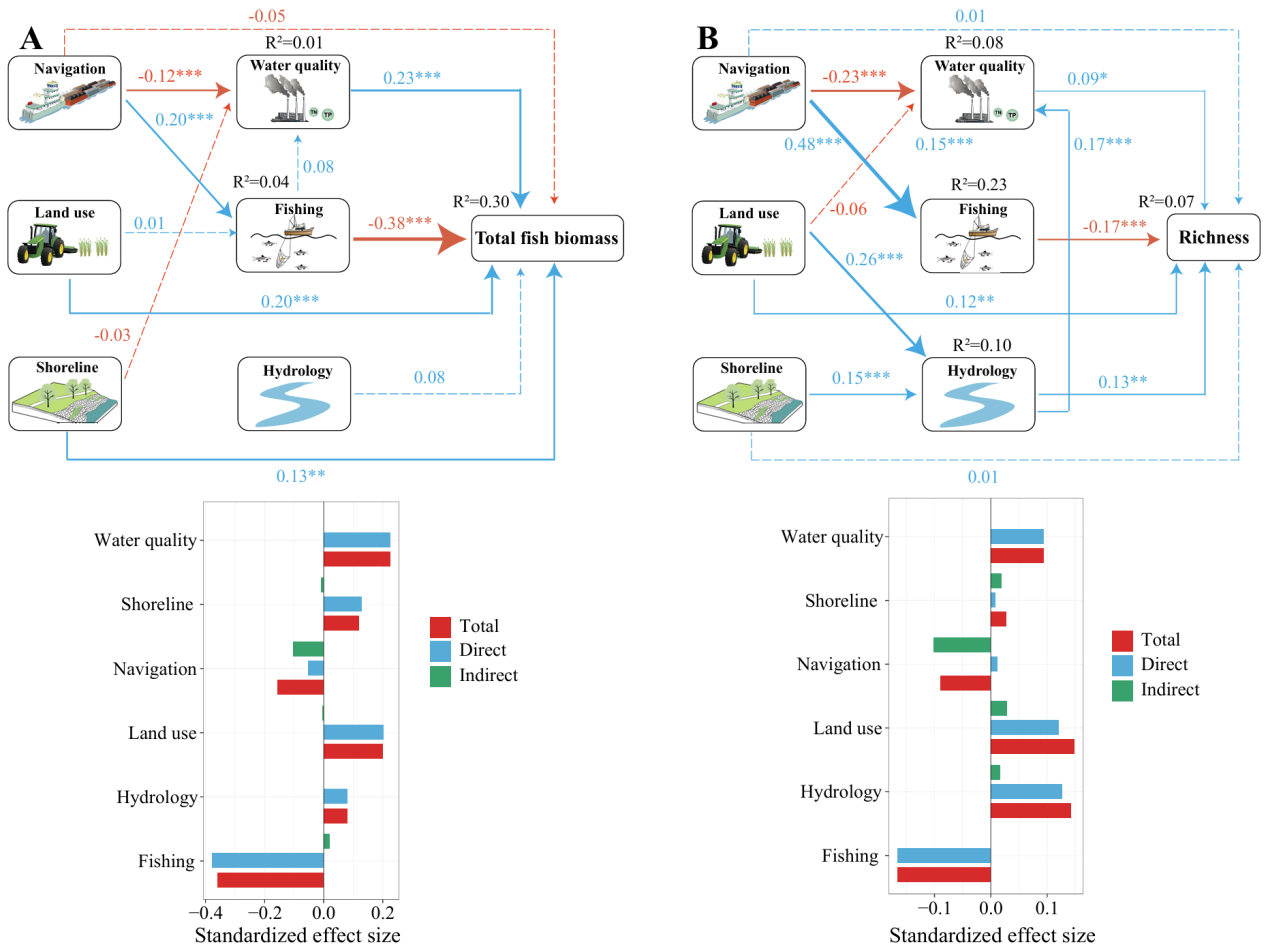 在全面禁渔期间,长江流域的渔业捕捞压力完全消除,航运、岸带开发利用等压力减少,水质得到了提升。结合广义最小二乘法和分段结构方程模型,研究进一步确证了全面禁渔是驱动长江鱼类资源初期恢复的主要和直接的因素,其他压力因子的缓解及水质的提升起到了协同贡献作用(图3)。